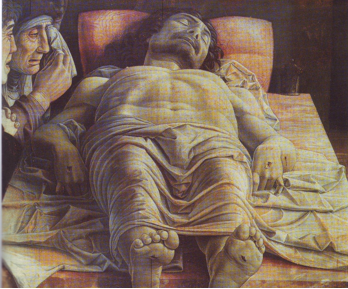 Gjennom teksten knyttes bildet til et virkelig liv som føles nærværende i det sterke motivet. På et representerende nivå henviser det derimot til renessansemaleren Andrea Mantegnas bilde av den døde Kristus (fig. 2), både gjennom motiv, koloritt og komposisjon. For som Kristus i Mantegnas bilde er også Nebredas skikkelse hvit, mager og med stigmata i føttene, og bildene har den samme litt blasse hvite og rødlige tonen som Mantegnas bilde har i dag. I renessansemaleriet ligger Jesus vertikalt innover i bildet, og dybde konstrueres gjennom forkortning. Nebredas skikkelse er plassert på samme måte, og de tynne leggene – som virker unormalt lange mot den spinkle og halvt tildekkede kroppen – gir illusjon om en tilsvarende forkortning.
