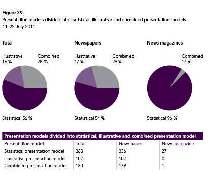 Ser man på isolert på avisene, dominerer statistisk grafikk med 54 prosent. Den nest største gruppen er kombinert grafikk med 29 prosent, mens illustrerende grafikk er 17 prosent.