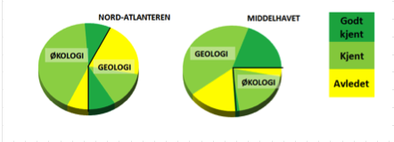 Relativ andel informasjon som ble funnet for ulike forskningsfelt og i de ulike kunnskaps-kategoriene, for Nord-Atlanteren (venstre) og Middelhavet (høyre).