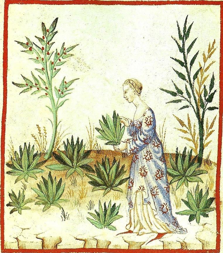 Kvinne som sanker legende urter. Kunnskap om legeurtenes bruksområder gikk i arv fra mor til datter. (Italiensk manuskript fra det 15. århundre.)