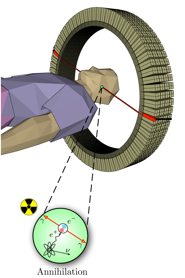 Når det radioaktive sukkeret FDG har blitt tatt opp rundt om i kroppen, ønsker vi å vite hvor. Dette kan PET-skanneren vise oss. FDG er radioaktivt og vil hele tiden sende ut positroner, som er et annet navn for anti-elektroner. Positronene som blir sendt ut vil med en gang møte elektroner i kroppen. Det spesielle med positroner er at når de møter elektroner, vil både positronet og elektronet forsvinne, og de danner to lysglimt.
