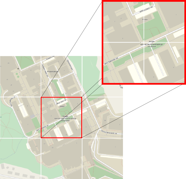 Tidligere i år skrev Robert om nettkart levert på vektorform her på Masterbloggen. Dagens nettkart er gigantiske bilder som er laget på forhånd, akkurat som et tradisjonelt kart på papir. Når man bruker store målestokker, vil et slikt bilde bli altfor stort å sende over nettet. Derfor deles disse kartene i mindre biter. De følger dermed fortsatt samme prinsipp som turkartene med oversiktskart, slik at man kun trenger å laste ned den delen av kartet man trenger.